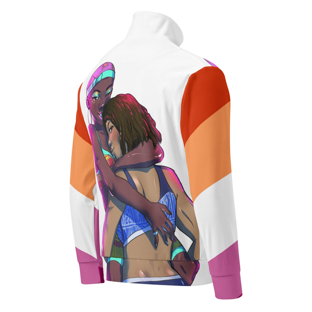 Track jacket inspired by my illustration series of les-bians. Here there is a cameroonian lesbian carrying a carribean bisexual woman.